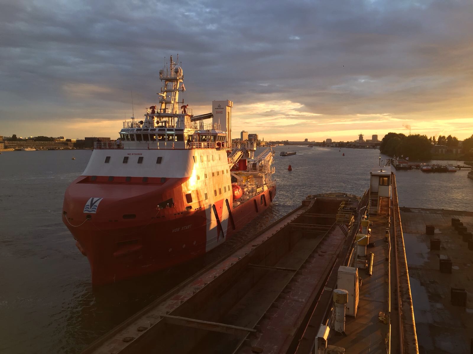 The 80m VOS Start – Vroon’s first DP2, subsea-support, walk-to-work vessel – arrived at Oranjewerf on 1 June from her build yard in China for the installation of a motion-compensated gangway system by Barge Master and Bosch Rexroth, the extended installation of a Kongsberg reference system (including a ‘windfarm module’), and an active heave-compensated crane from SMST.