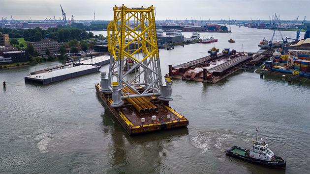 The offshore substation jacket for Borkum Riffgrund 2 leaving the Schiedam harbour in the Netherlands.. Image source: DONG Energy