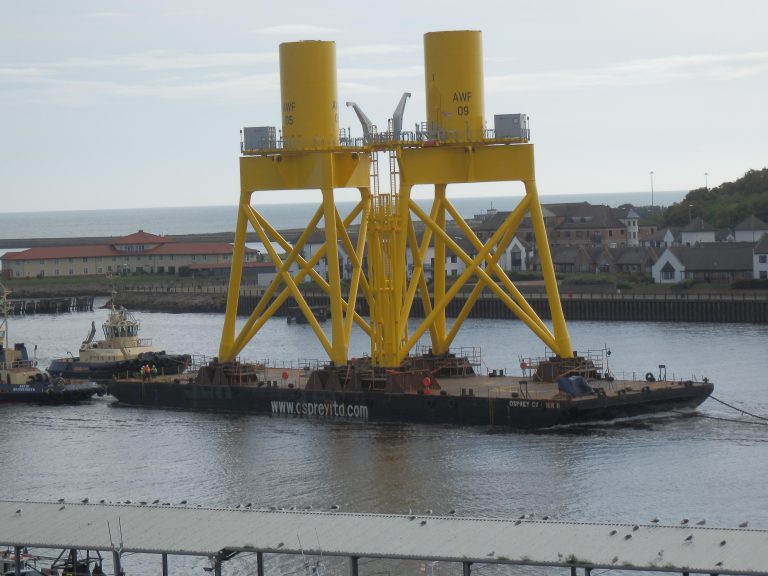 Osprey Construction and Marine Logistics has posted a photo of their Osprey Carrier II barge entering the Tyne, Newcastle, with the first two jacket top sections for the 92.5MW European offshore wind deployment centre (EOWDC) on 30 September.