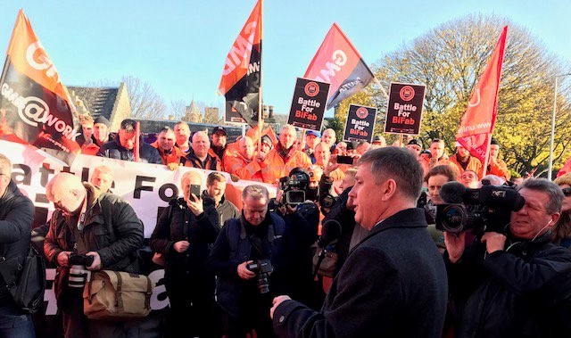 Keith Brown, MSP, addresses BiFab workers at this morning’s rally. Image source: GMB Scotland on Twitter (cropped)