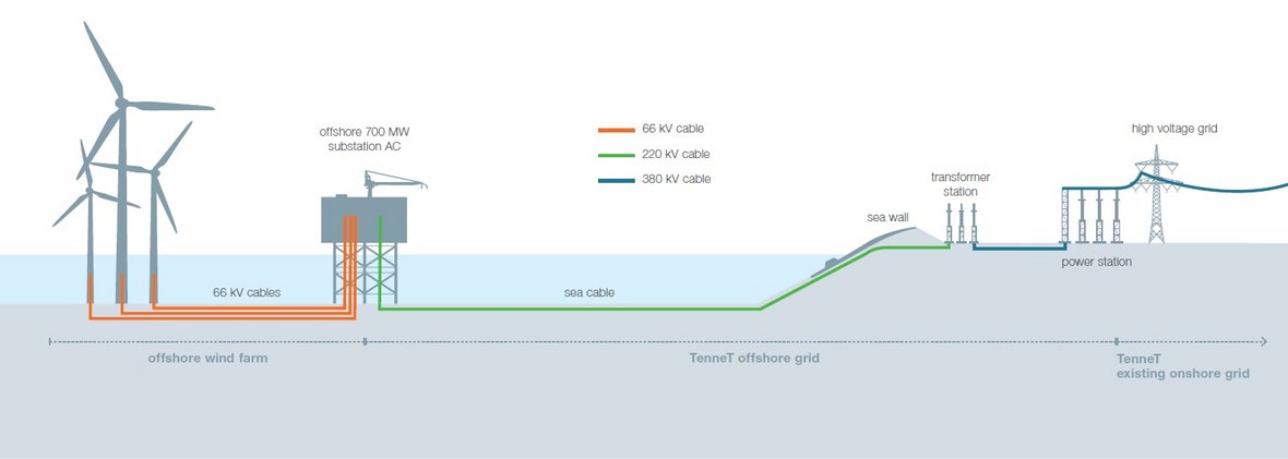The grid connection of the Hollandse Kust Zuid wind farm area will consist of two offshore HVAC substations and cable systems. Each cable system will comprise two circuits, with each circuit consisting of one three-core 220kV AC subsea cable, which will also be used for the onshore part. The landfall of the cables will be done via four pre-installed underground HDPE pipelines between seabed and landstation.