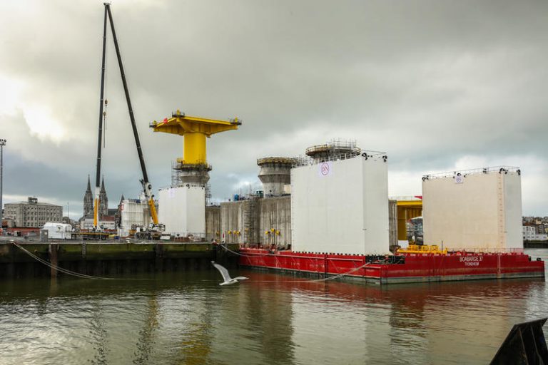 The foundations have a weight of 10,000 tonnes and 8,000 tonnes and are being constructed on top of a barge in the port of Ostend.