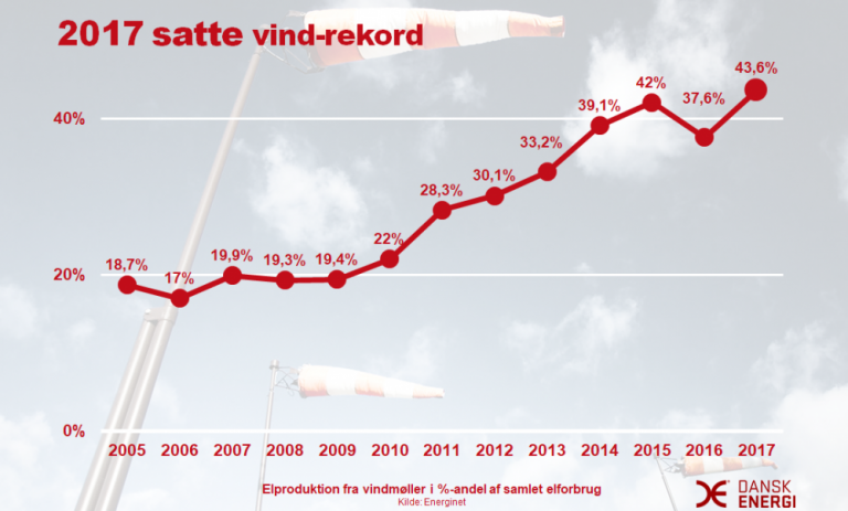 Wind farms across Denmark, both on land and those in Danish waters, broke record in 2017 by producing electricity equivalent to 43.6% of the country’s total consumption. Until the end of 2017, the record year was 2015, when wind power delivered an equivalent of 42% of Danish electricity consumption, according to Dansk Energi.
