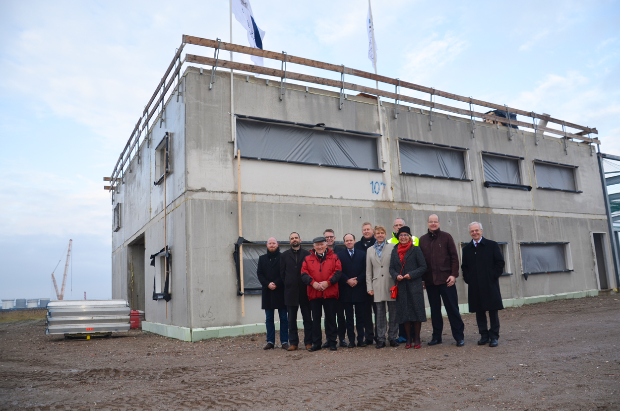 EMS Maritime Offshore (EMO) has celebrated the topping-out ceremony of its second building for the Merkur offshore wind farm service base in Eemshaven, the Netherlands, and expects to have it fully built on time with no delays despite winter weather.