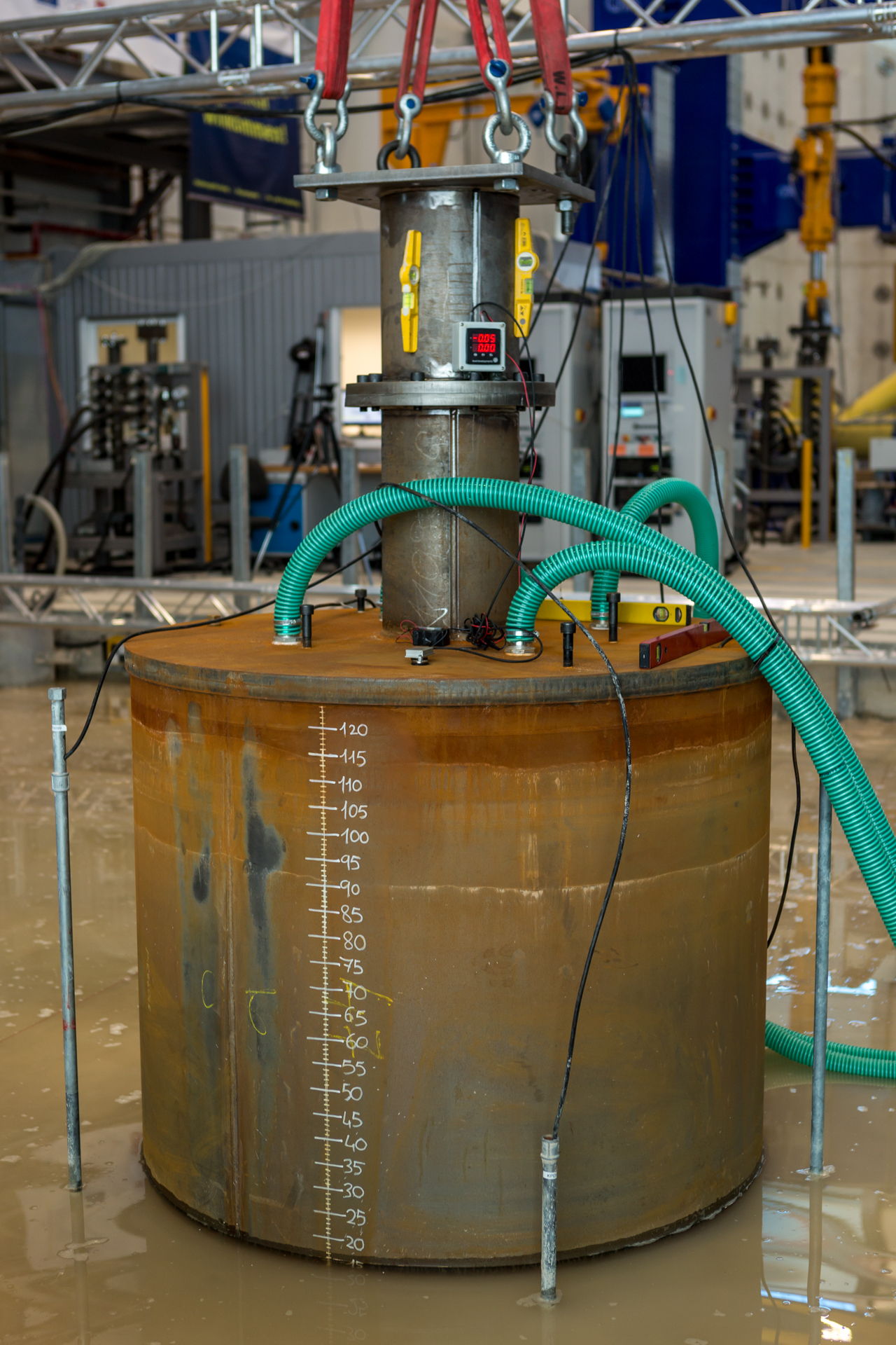 During the installation process, the steel cylinder was sunk just over a meter into the saturated sand. Once the bucket has been in position for a few days, the tensile load tests will begin, which will be used to simulate the effects of extreme waves on the structure in the foundation test pit.
