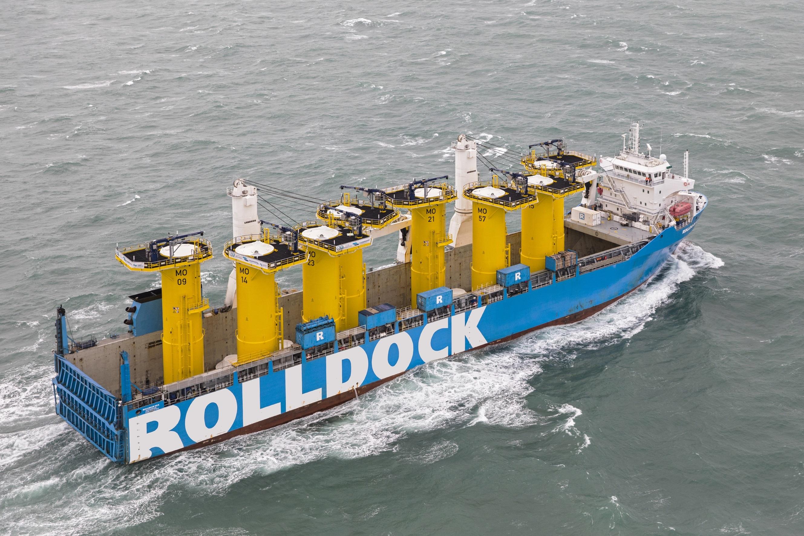 RollDock is currently transporting the transition pieces (TPs) for the Merkur offshore wind farm from Aviles, Spain, to the Buss Orange Blue Terminal in the Eemshaven port, the Netherlands.