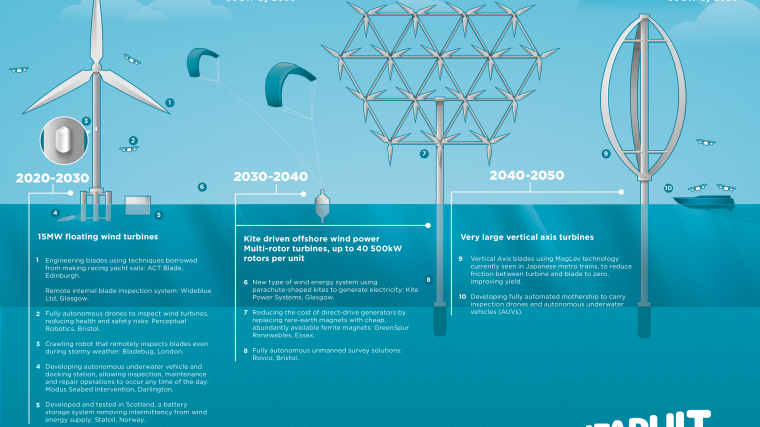 From 2040 onward, vertical axis turbines, now still in their infancy, will start to address the challenges current designs pose in weight, with larger traditional blades becoming less feasible on a tower structure. These vertical axis blades will have numerous other benefits, such as being able to generate power no matter which direction the wind is blowing in.