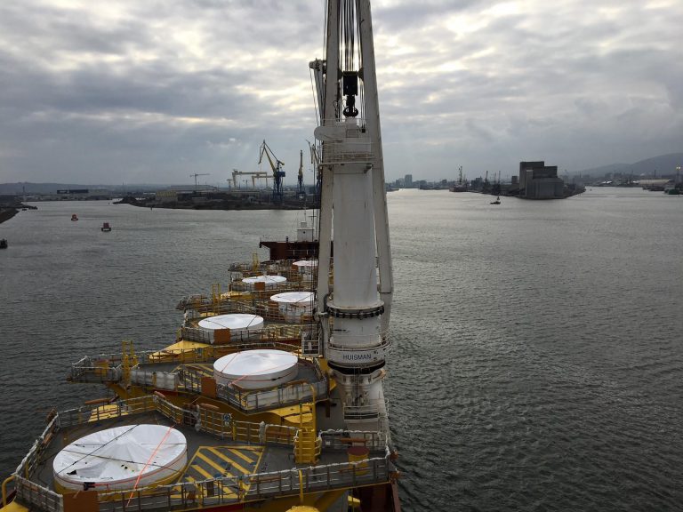 Belfast Harbour has published a photo showing the heavy lift vessel Happy River arriving at the port with 12 transition pieces for the 714MW East Anglia ONE offshore wind farm.