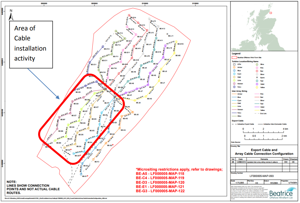 The 588MW Beatrice offshore wind farm comprises 84 Siemens 7MW wind turbines and two Siemens Offshore Transformer Modules which will be inter-connected by 91 x 33kV medium voltage alternating current submarine composite cables, manufactured by JDR.