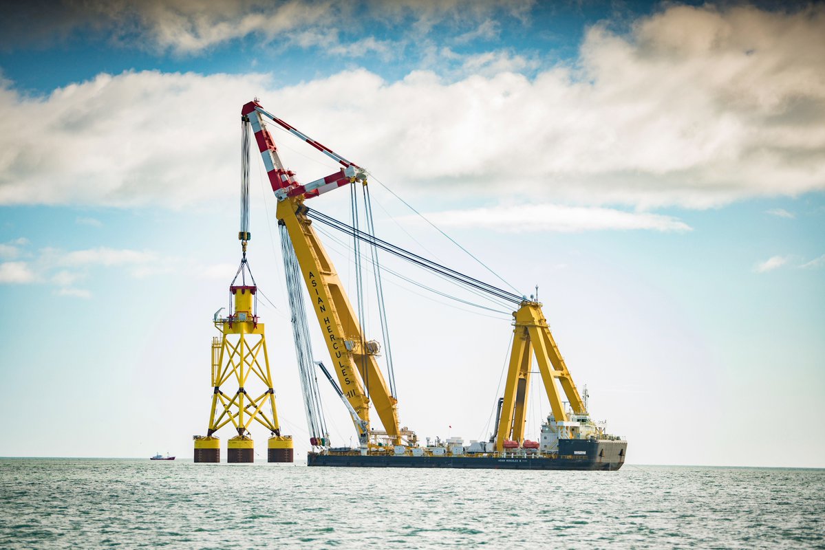 The floating crane Asian Hercules III has installed the first of eleven suction bucket jacket foundations on Vattenfall’s European Offshore Wind Deployment Centre (EOWDC) in the Aberdeen Bay, Scotland.