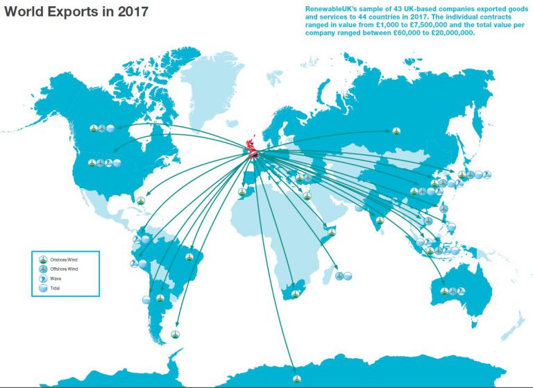 Forty-three British companies doing business in wind and marine energy sectors closed 445 deals for 434 projects across the globe and exported goods and services to 44 countries in 2017, with Germany being the leading market, according to RenewableUK’s latest report Export Nation