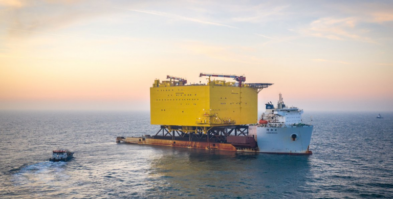 The installation will be carried out through a float-over process, which means the topside is pulled over the jacket by letting water into the barge to lower the structure onto the foundation.