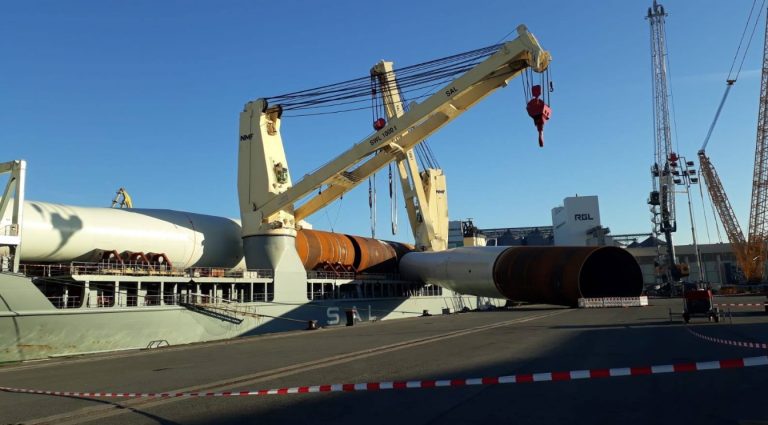 A turbine monopile has fallen while being loaded onto SAL Heavy Lift’s multi-purpose cargo ship Svenja at the Port of Rostock, according to the local police.