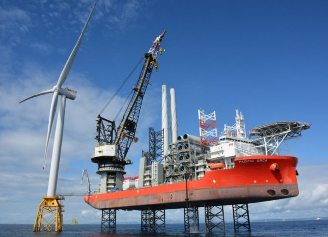 The jack-up vessel Pacific Orca is installing the project’s 84 wind turbines, while the commissioning works are being undertaken by using the walk-to-work vessel Island Crown and crew transfer vessels (CTVs) Seacat Resolute and Fob Swath 3.