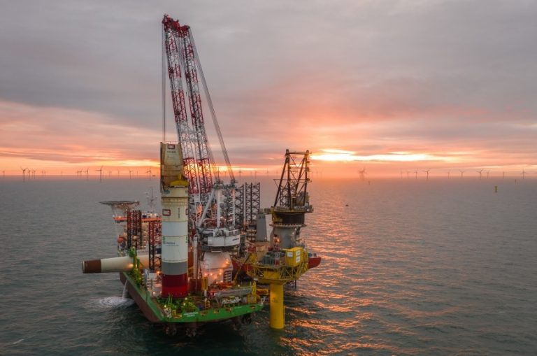 Pacific Osprey had loaded the topside in Rotterdam. In the construction area, the Innovation lifted the topside on the monopile foundation.