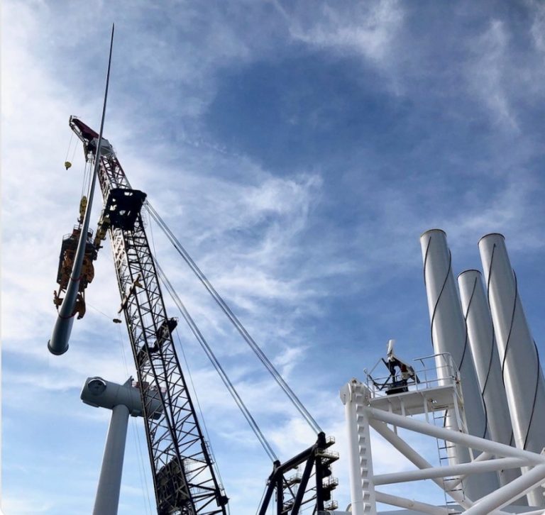 Swire Blue Ocean’s jack-up is loading the turbines in sets of five at the Nigg port, Siemens Gamesa’s pre-assembly base, and installing them at the site 13 kilometres off the Caithness coast.