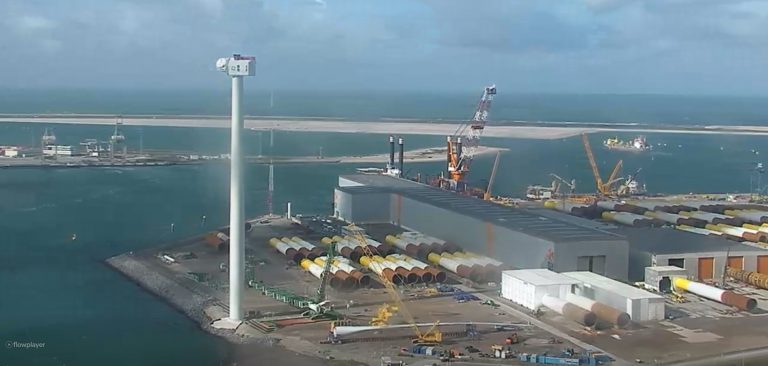 The first blade for the prototype GE Haliade-X 12 MW offshore wind turbine has arrived at Maasvlakte, according to the live webcam feed at the Port of Rotterdam.