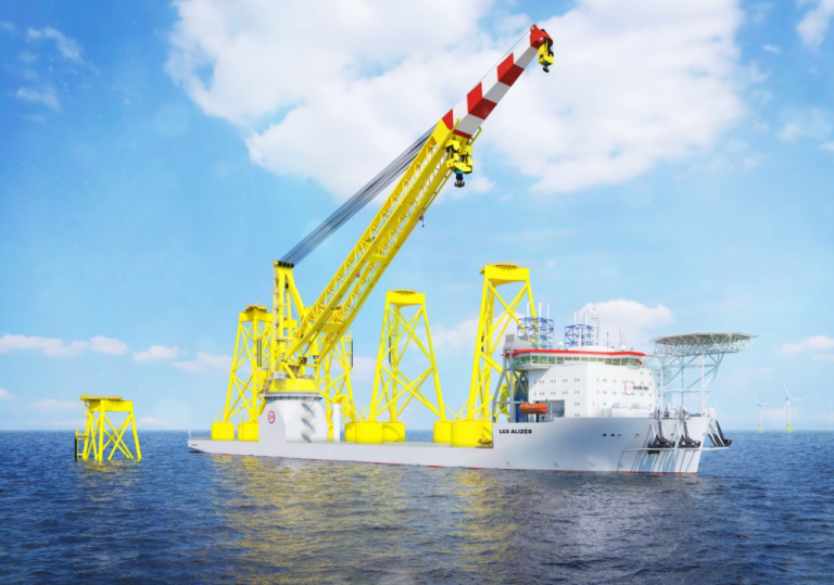 Les Alizés is specifically designed for loading, transporting, lifting and installing offshore wind turbine foundations. The main features are a main crane of 5,000 tons, a deck loading capacity of 61,000 tons and a deck space of 9,300 m².