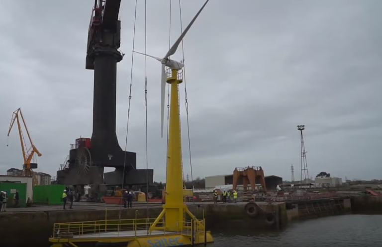 After being fully assembled onshore, the scaled-down version of the BlueSATH floating wind turbine prototype has been lowered into water, Saitec Offshore Technologies said.