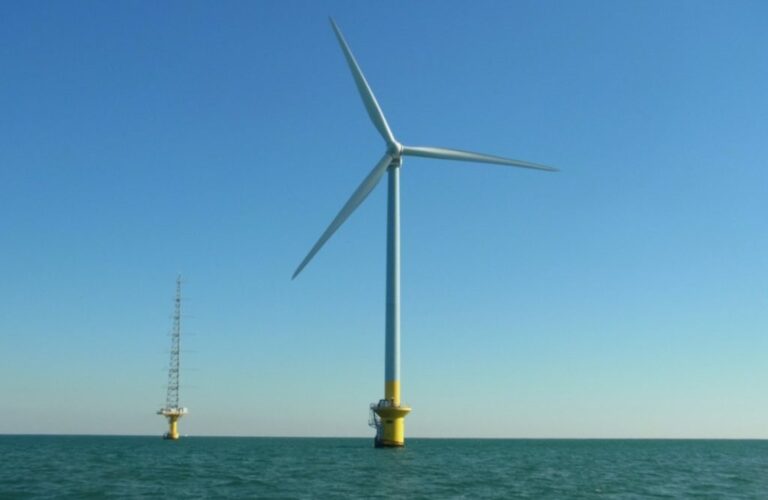A photo of an offshore wind turbine in Japan, with a met mast in the background on the left