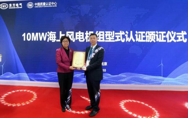 Dongfang Electric Corporation (DEC) has received the type certificate from the China Quality Certification Center for its 10 MW offshore wind turbine.