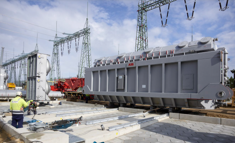 A 320-tonne transformer is placed on the foundation equipped with rails at Lubmin substation site
