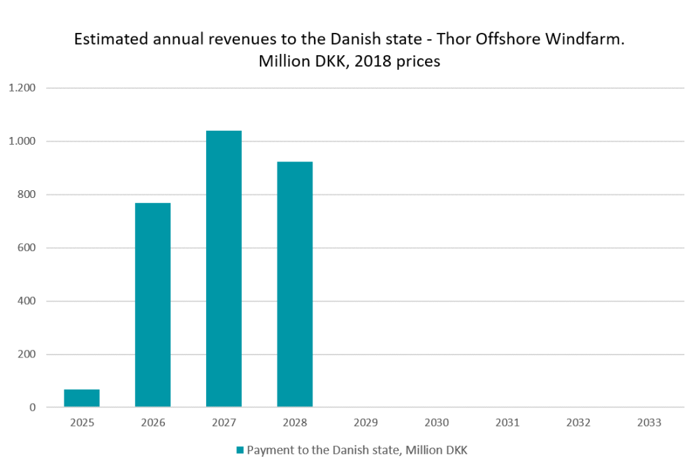 With the expected electricity prices from 2026 onwards, when the 1 GW Thor is scheduled to produce first power, the bid winner is anticipated to have paid the state DKK 2.8 billion (around EUR 376 million) within only a few years. After that, in practice, there will be no financial balance between the state and the bid winner, and the wind farm will be run on purely commercial terms, without support, for the rest of its 30-year lifespan.