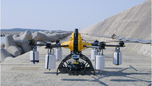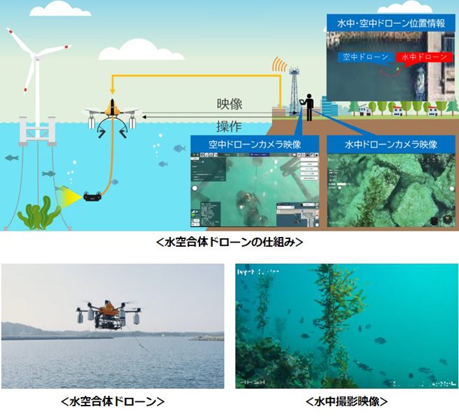 The drone, which supports mobile communication and autonomous flight and remote control, transmits video imagery from aerial and underwater cameras in real time and features an acoustic positioning device which allows for checking the location information underwater where the satellite positioning system (GPS) cannot be used.