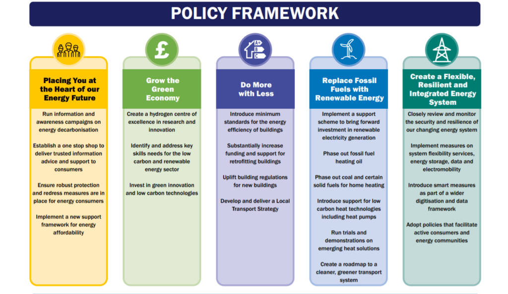 One of the main goals of the new energy strategy is to replace fossil fuels with renewable energy by phasing out fossil fuels while growing Northern Ireland’s own renewable base, supported by sustainable renewable imports and use these to decarbonise power, heat and transport.