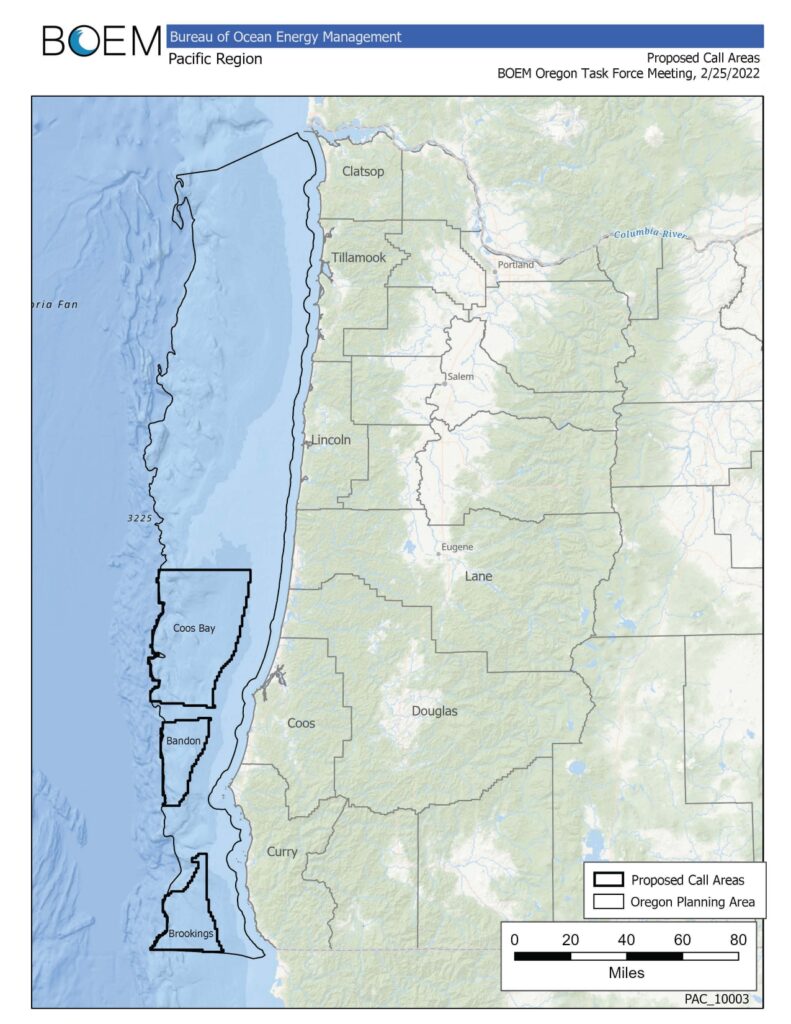 The agency has identified Call Areas offshore the cities of Coos Bay, Bandon, and Brookings which span 5,651 square kilometres and could accommodate a total of 16,956 MW of installed offshore wind capacity.
