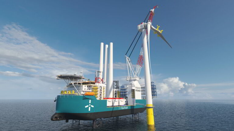 An artist impression of Havfram's new wind turbine installation vessel at work