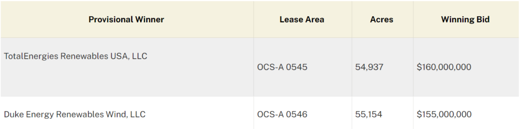 TotalEnergies and Duke Energy are the provisional winners of the Carolina Long Bay offshore wind lease sale in the US, with their competitive winning bids totaling USD 315 million.