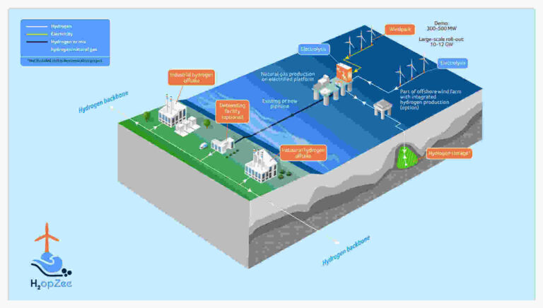 H2opZee, announced earlier this year and planned to be built before 2030 in the Dutch North Sea, is a demonstration project which aims to build 300-500 MW electrolyser capacity to produce green hydrogen using offshore wind and to transport it to land through an existing pipeline.