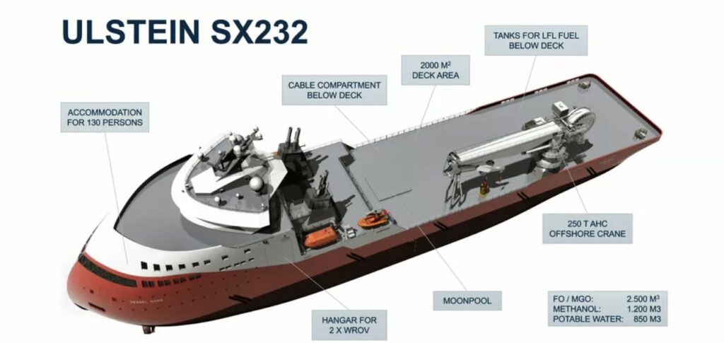 Ulstein said that the SX232 is based on three core principles, including an optimized hull design based on the Ulstein Twin X-Stern, a smart power and propulsion system developed to minimize energy consumption during DP operations, and an integrated energy recovery system utilizing all the waste heat in the machinery systems (cooling water and exhaust).