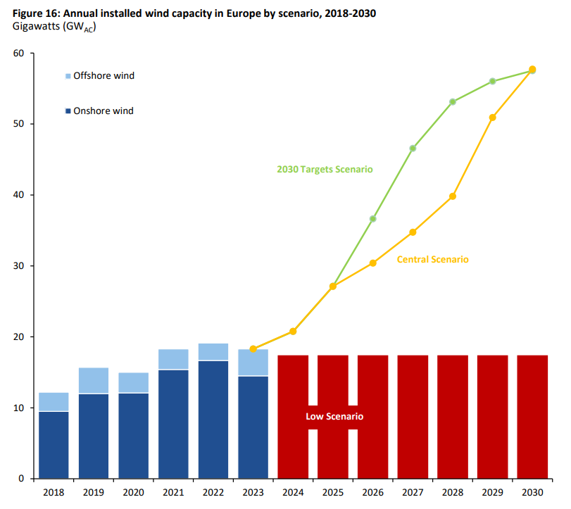 According to the report’s central scenario, which represents the most likely outcome for European wind capacity build-out through 2030, offshore and onshore wind installation combined are expected to surpass 50 GW per year by the late 2020s.