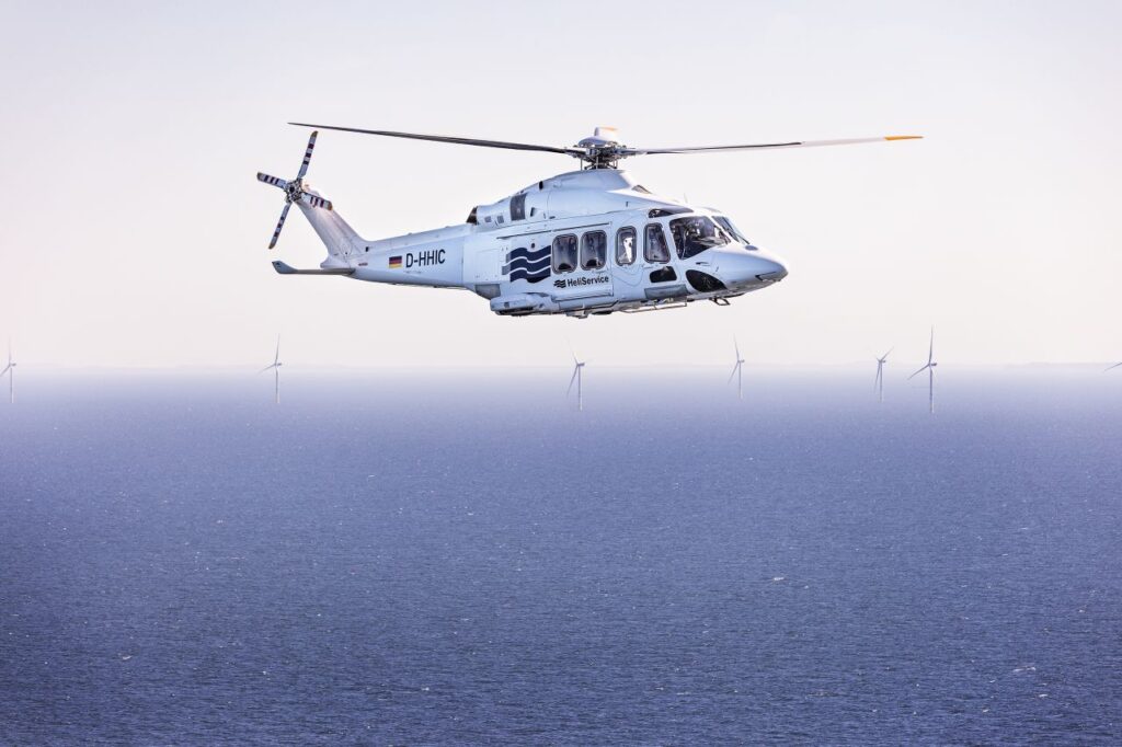 HeliService’s Leonardo AW139 helicopter in flight offshore; Photo source: Vestas