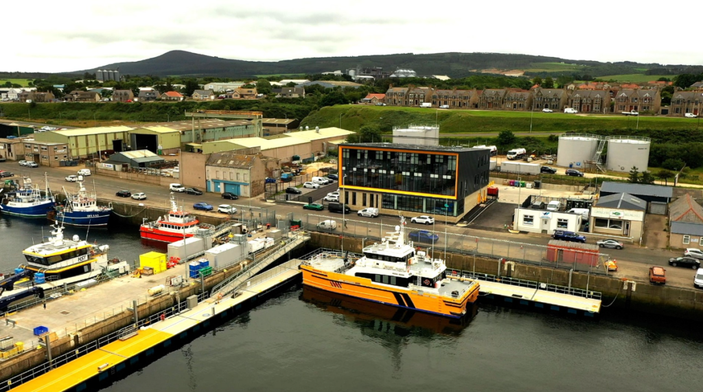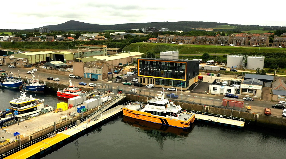 The facility, built by Scottish contractors, includes offices, warehousing, and training facilities, as well as a redeveloped quayside area that features pontoons, cranes, and fuel storage to serve the crew transfer vessels (CTVs) taking personnel and equipment to the wind farm every day.