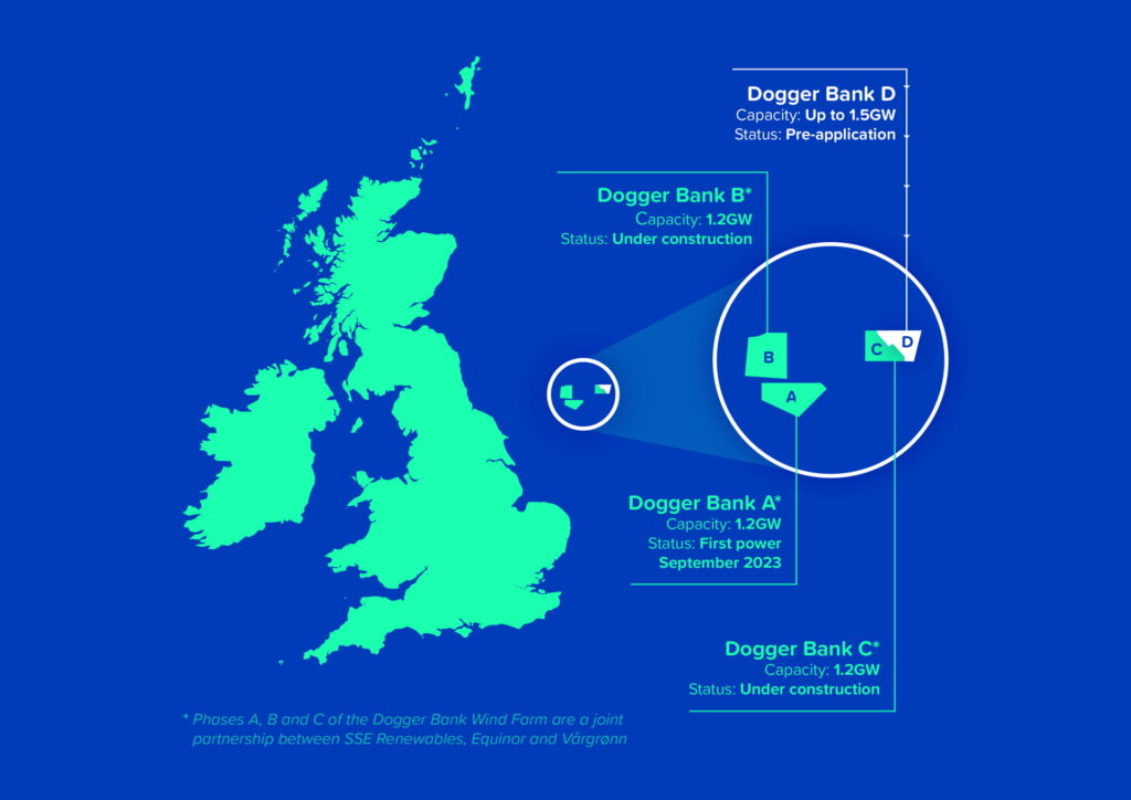 The first three phases of the Dogger Bank Wind Farm are currently under construction. With an installed capacity of 1.2 GW each, Dogger Bank A, B and C will make up the world’s biggest offshore wind farm with a capacity of 3.6 GW, which would increase to 5.1 GW with Dogger Bank D.