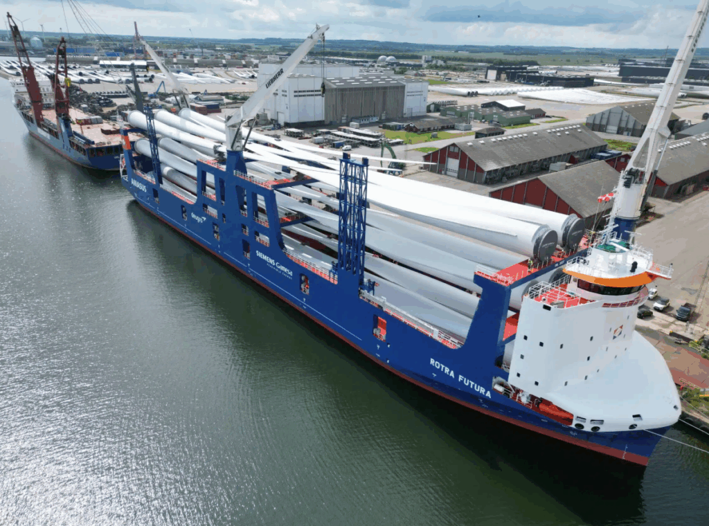 Deugro’s Rotra Futura, which was delivered in April 2025, has officially commenced operations with the transportation of offshore wind turbine blades from Denmark to the US.