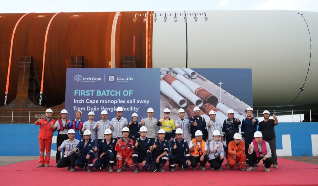 Dajin Heavy Industry has sent away the first batch of six monopiles that will be installed at the 1.1 GW Inch Cape offshore wind farm in Scotland.