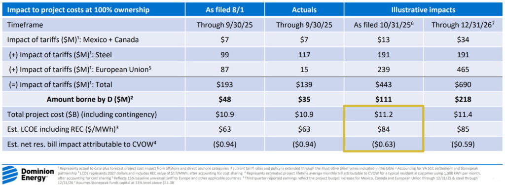 Dominion Energy said in its third-quarter 2025 results that recently imposed US tariffs have been incorporated into the updated cost estimate for the Coastal Virginia Offshore Wind (CVOW) project.